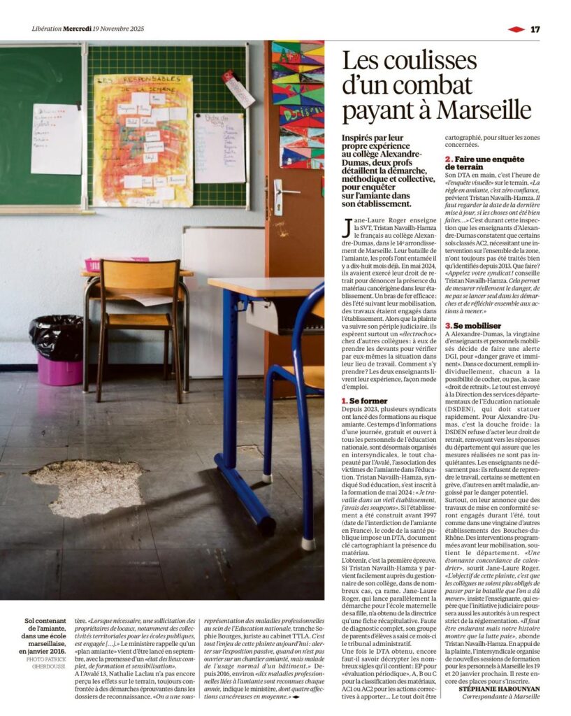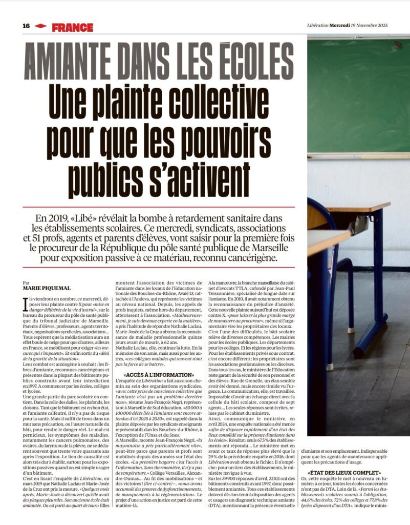 Ce mercredi, syndicats, associations et 51 profs, agents et parents d’élèves, vont saisir le procureur de la République du pôle santé publique de Marseille pour exposition passive à ce matériau, reconnu cancérigène.